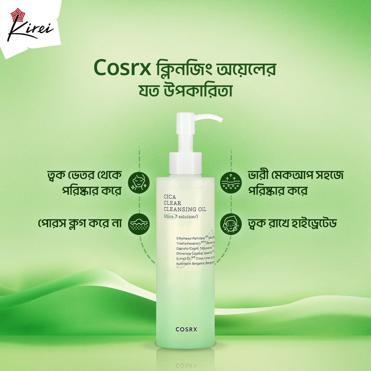 Ethylhexyl Palmitate, Sorbeth-30 Tetraoleate, Triethylhexanoin, Glycine Soja (Soybean) Oil, Caprylic/Capric Triglyceride, Simmondsia Chinensis (Jojoba) Seed Oil, Citrus Aurantifolia (Lime) Oil, Citrus Limon (Lemon) Peel Oil, Citrus Aurantium Bergamia (Bergamot) Fruit Oil, Tocopherol, Helianthus Annuus (Sunflower) Seed Oil, Caprylyl Glycol, Ethylhexylglycerin, Avena Sativa (Oat) Kernel Oil, Olea Europaea (Olive) Fruit Oil, Oenothera Biennis (Evening Primrose) Oil, Persea Gratissima (Avocado) Oil, Prunus Amygdalus Dulcis (Sweet Almond) Oil, Water, 1,2-Hexanediol, Centella Asiatica Extract, Centella Asiatica Leaf Extract, Centella Asiatica Root Extract, Pinus Pinaster Bark Extract, Asiaticoside, Asiatic Acid, Madecassoside, Madecassic Acid