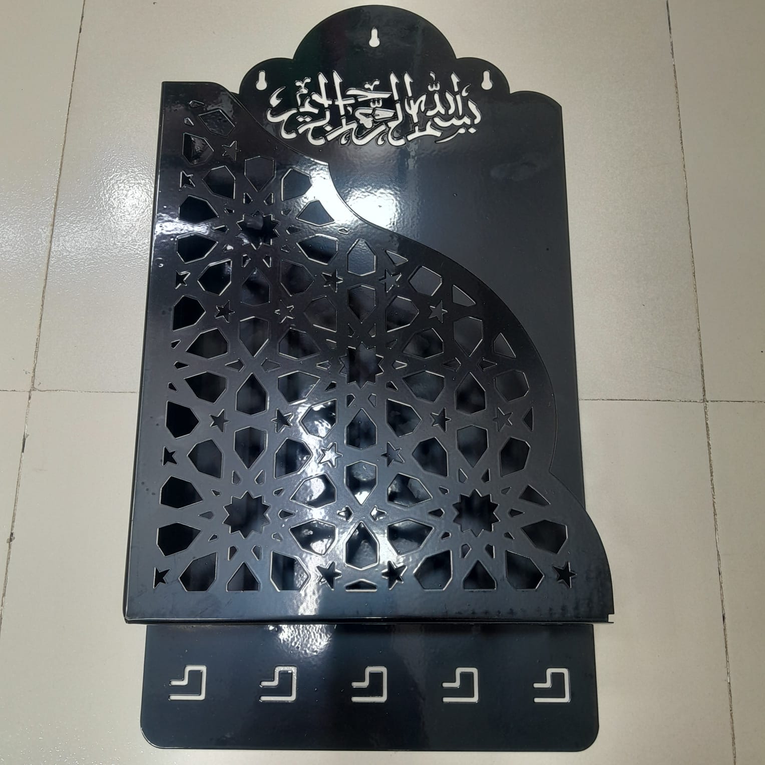 Practical and beautiful Quran Bookshelf for your home from Wall Art Istanbul, hangers for your tasbeeh and keys, too. Bismillah is Written at the Top of the Wall Quran Box Personalized Text Needed Here: Up to 16 Characters Designed and produced by Wall Art Istanbul with high-quality steel Easy to Hang 25 x 45 x 5 cm (10 x 18 x 2 inches) - 1.5 Kg (3.3 lbs) Cancellation and return are not accepted for personalized products